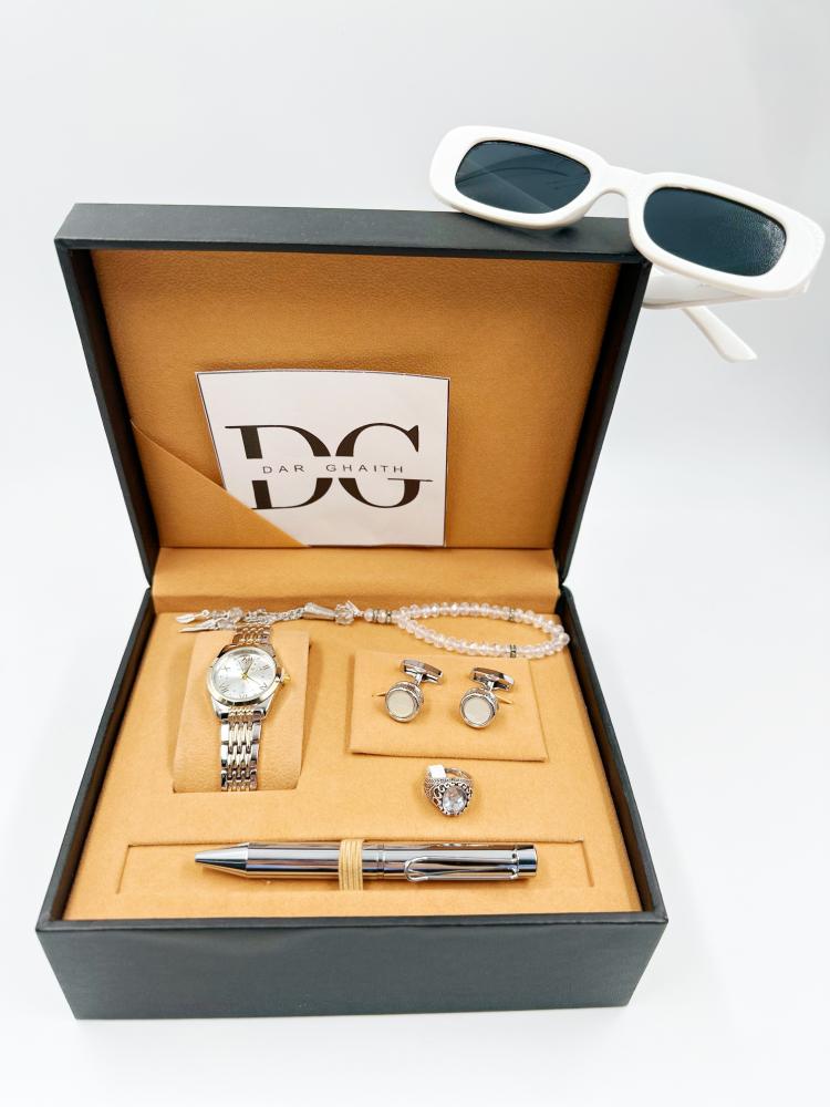 ساعة - سبحة -قلم - خاتم - كبك - و نظارة هدية ( شكل عشوائي ) منسقة مع الطقم
